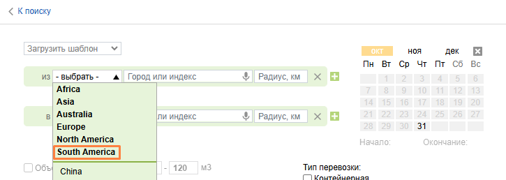 Радиус. Укажите радиус (км) от пункта загрузки/разгрузки, в пределах которого вы готовы отъехать, чтобы загрузить/выгрузить груз. Это позволит увеличить количество предложений при поиске.