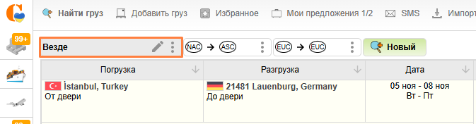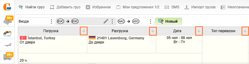 Результаты поиска будут выведены во вкладке в виде таблицы, которые вы можете отсортировать по алфавиту (пункты погрузки, разгрузки, тип перевозки, компания), а также по дате.