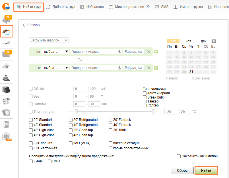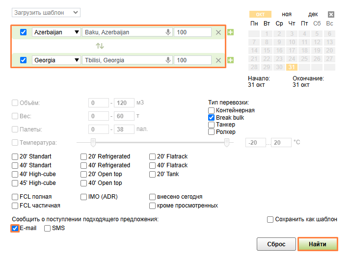 Перейдите в раздел Морские, нажмите Найти груз и в форме поиска заполните необходимые параметры, после чего нажмите Найти.