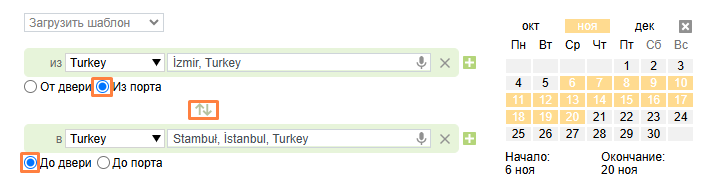 От двери/До двери, Из порта/в порт. Если ваш груз необходимо транспортировать до/от порта другим видом транспорта, сообщайте об этом перевозчику с помощью отметки От двери/До двери.
