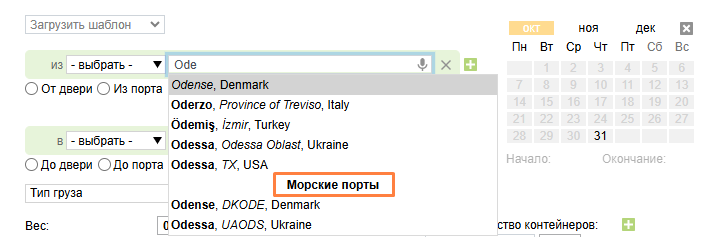 Впишите вес груза вручную. Если необходимо, укажите дополнительные параметры морского груза.