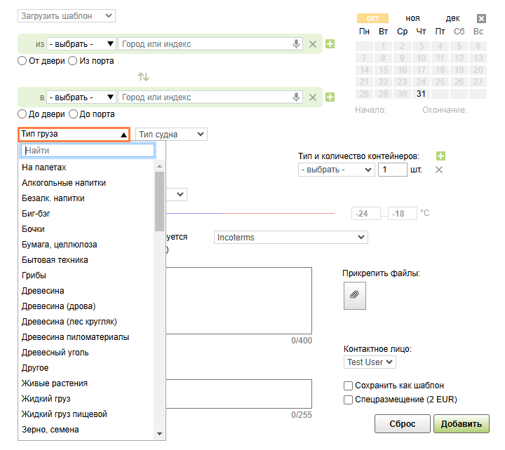 3. Тип груза. В выпадающем списке отображены типы грузов.