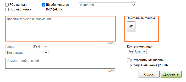 4. Дополнительная информация. Если необходимо указать дополнительные параметры груза, впишите их в данное поле. Запрещается указывать номер телефона свой или третьих лиц. Есть возможность прикрепить файл, для этого нажмите на иконку Прикрепить.