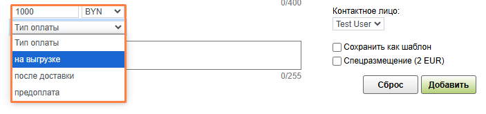 5. Тип оплаты. Выберите необходимый тип оплаты из представленных: на выгрузке, после доставки или предоплата. Укажите стоимость.