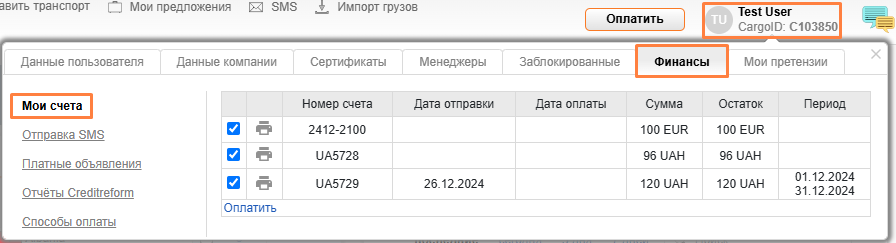 Чтобы посмотреть выставленные вашей фирме счета, нажмите на свое имя в правом верхнем углу сайта и перейдите во вкладку Финансы. Вы сможете просмотреть архив счетов, а также текущий счет.