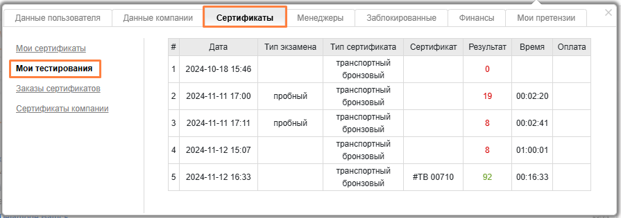 Для просмотра результатов пройденных тестов нажмите на свое имя, далее нажмите на Профиль пользователя. Во вкладке Сертификаты выберите Мои тестирования. В таблице отобразится информация о пройденных вами тестированиях.