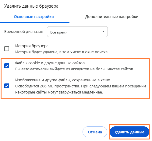 Нажмите Ctrl+Shift+Delete откроется новое окно с настройками. Выберите временной диапазон Всё время (All time), поставьте галочку в поле Изображения и другие файлы, сохраненные в кеше (Cached images and files) и нажмите кнопку Удалить данные (Clear data).