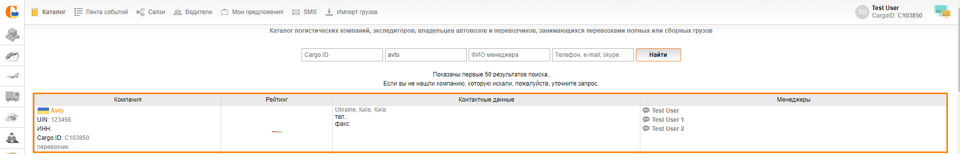 • обозначение участия в системе Cargo.Garant (при наведении на щиток отображается информация о сертификате компании).