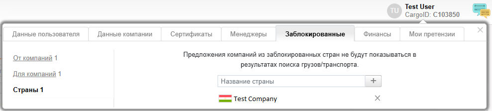 Чтобы скрыть предложения компаний из определенных стран при поиске грузов или транспорта, нажмите на свое имя, перейдите в Профиль пользователя, далее во вкладку Заблокированные. В левом столбце нажмите Страны. Введите название страны. Предложения компаний из заблокированных стран не будут показываться в результатах поиска грузов/транспорта.