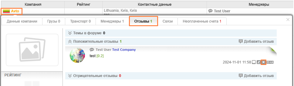 Зайдите в профиль компании (в каталоге) и перейдите во вкладку Отзывы, найдите свой отзыв и нажмите на иконку Удалить.