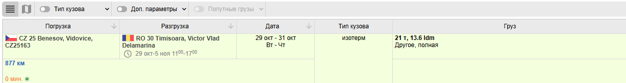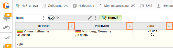 Результаты поиска будут выведены во вкладке в виде таблицы, которые вы можете отсортировать по алфавиту (пункты погрузки, разгрузки, компания), а также по дате.