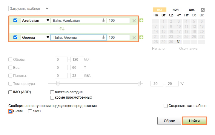 Подписка на направление. После указания пунктов загрузки/разгрузки отметьте галочкой, как вы хотите получать уведомления о поступлении подходящего предложения по данному направлению, – на e-mail или по SMS.
