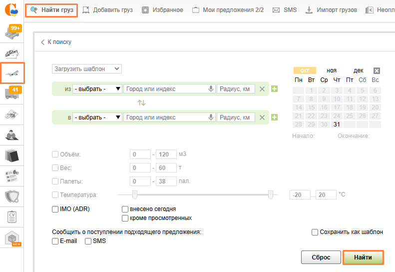 Перейдите в раздел Авиа, нажмите Найти груз и в форме поиска заполните необходимые параметры, после чего нажмите Найти.
