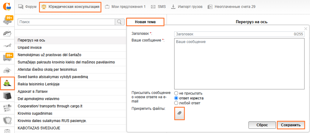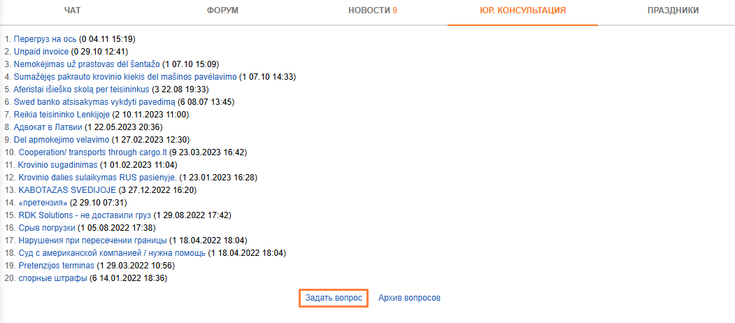 Чтобы задать вопрос юристу Cargo, перейдите в подраздел Юридическая консультация раздела Форум, нажав на кнопку Новая тема.